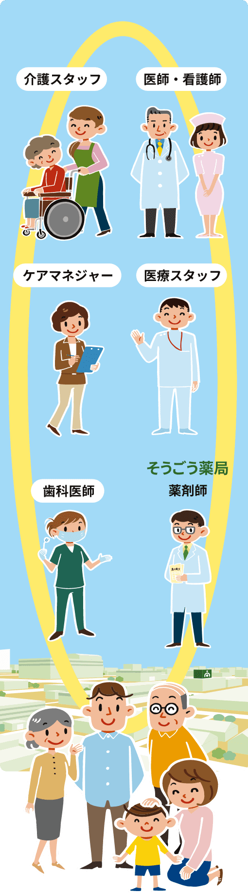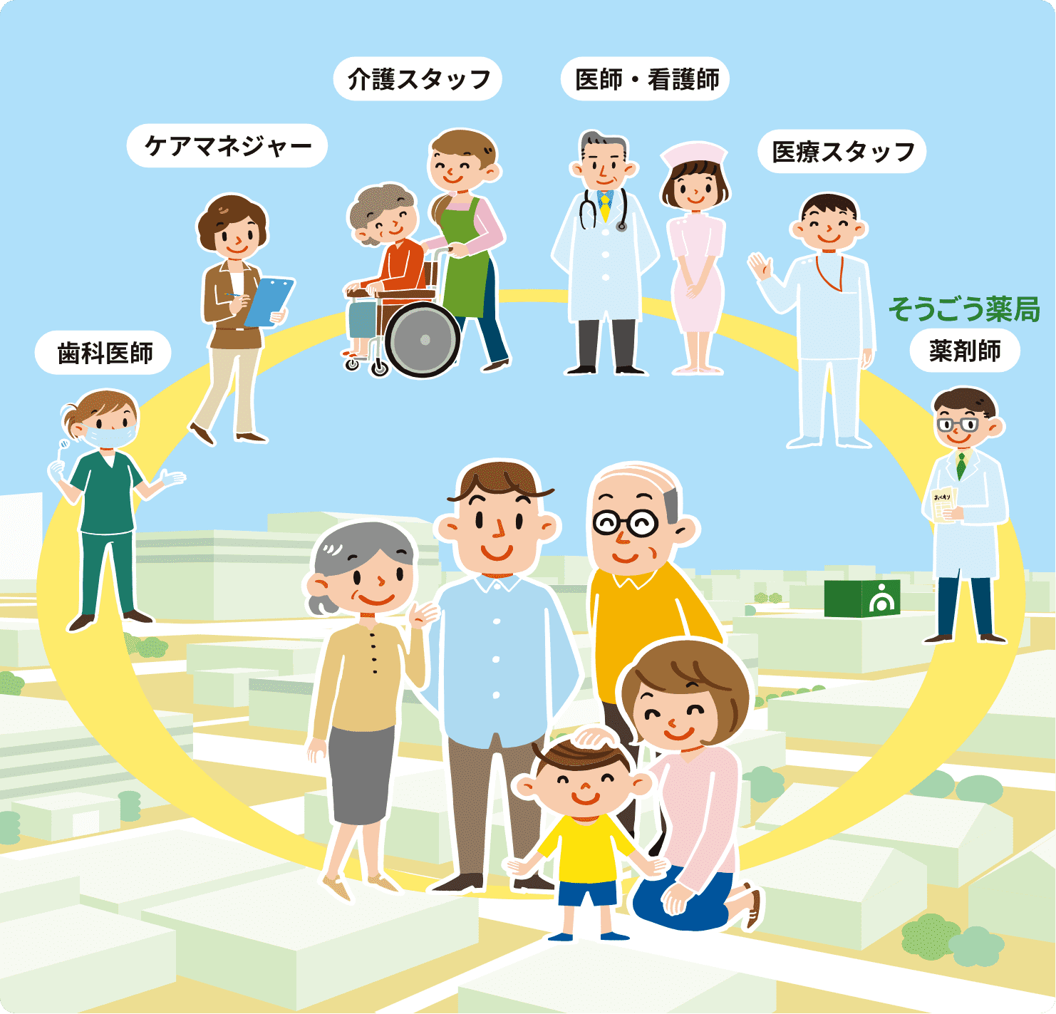 「そうごう薬局」では、地域医療を支えるさまざまな職種の方々と連携を図り、よりよい医療・介護環境をサポートします