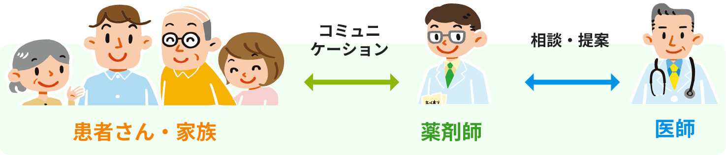 薬剤師は、お薬をとおして、お一人おひとりがより最適な医療をうけられるように、医師へ適時相談・提案をおこなっています。